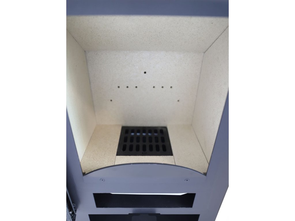 Topeniště je obložené vermikulitem. Na dně topeniště je umístěn litinový rošt.